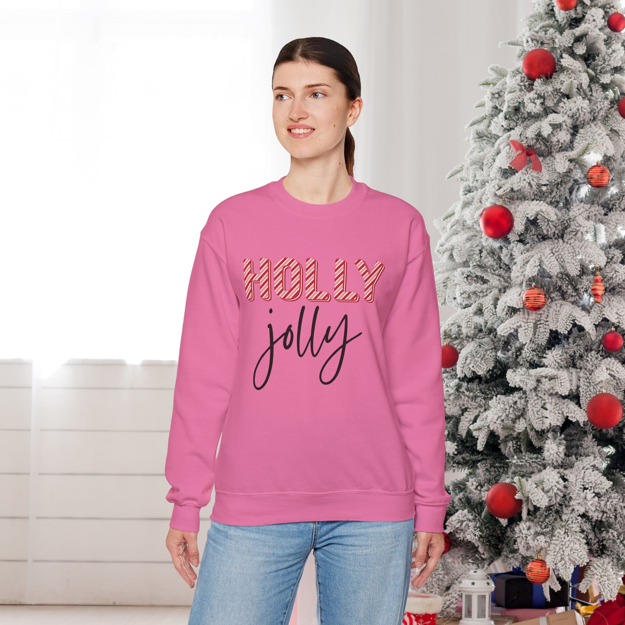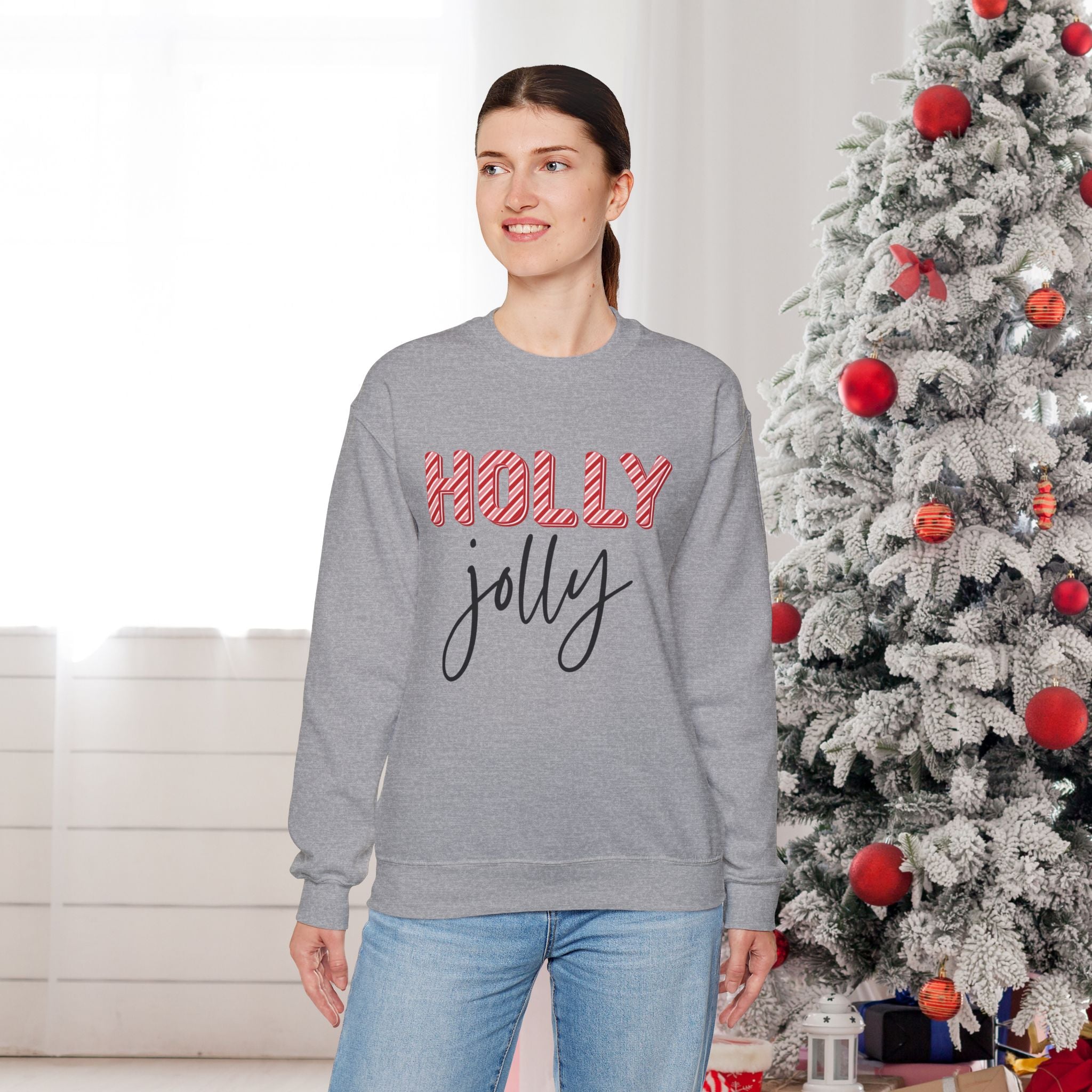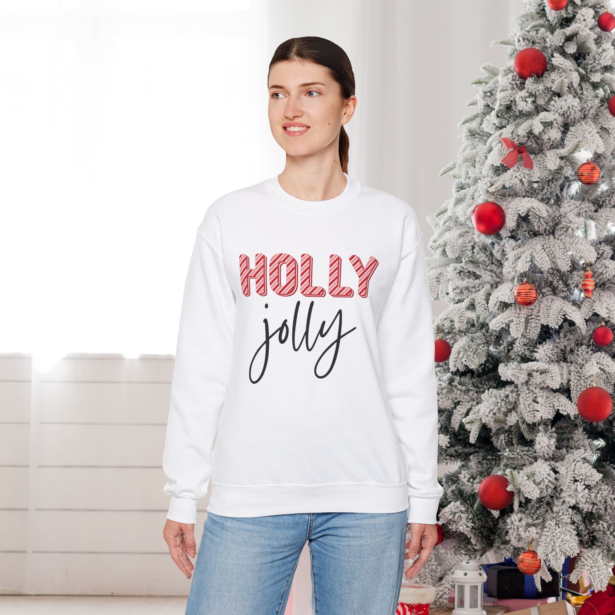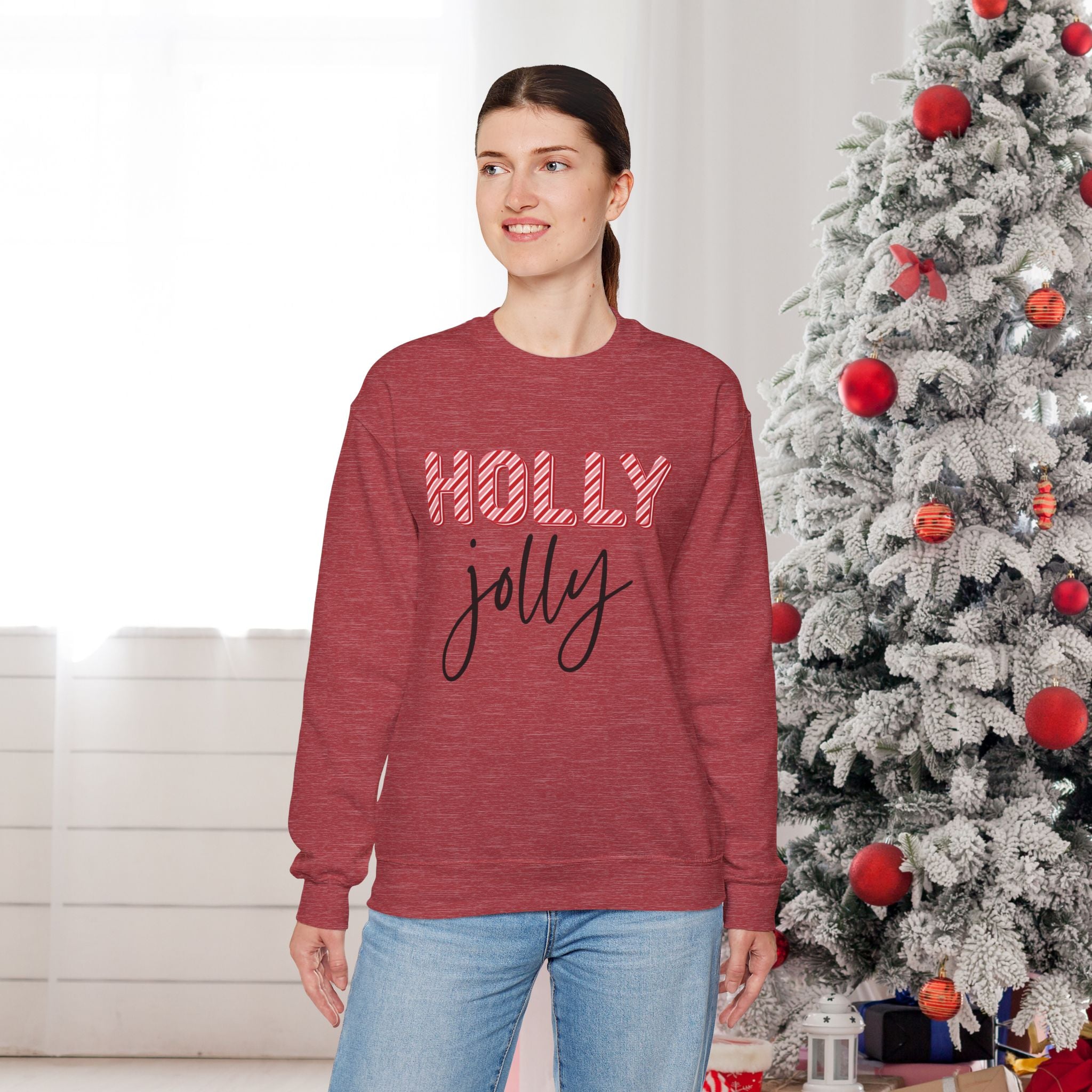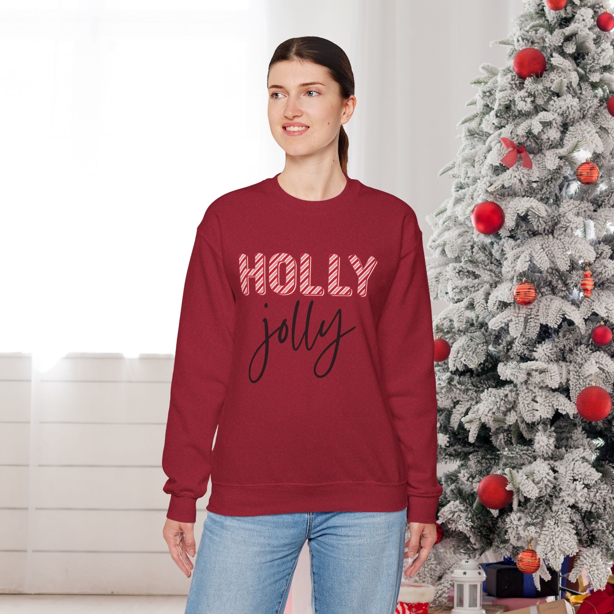 Stay cozy and festive during the winter months with this Holly Jolly Sweatshirt. Perfect for reminding you of the holiday festivities while keeping you warm and snug. Ideal for anyone looking to add a touch of holiday cheer to their wardrobe.